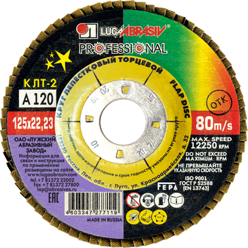 Круг лепестковый 125х22,23 конический А120 КЛТ2 LUGAABRASIV арт. 4603347277119 предназначен для обработки труднодоступных мест, торцевого и плоского шлифования. Коническая форма инструмента при работе, обеспечивает лучшее прилегание лепестков к поверхности металла. Зернистость А120.